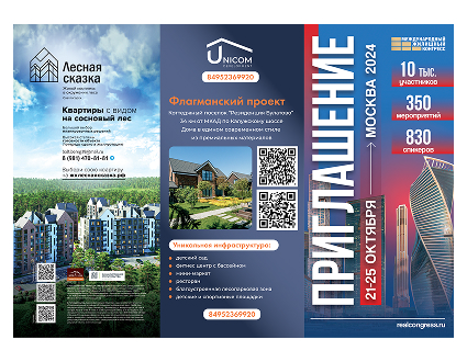 Евробуклет, тираж 8000 экз., цвет, глянец, распространяется среди профессионалов рынка недвижимости по всей России. В приглашении размещается программа Конгресса.