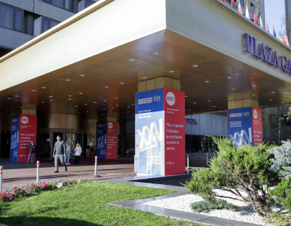 Размещение двухстороннего рекламного баннера на входе в фойе отеля Plaza Garden на период проведения Конгресса с 14 по 16 октября 2025.