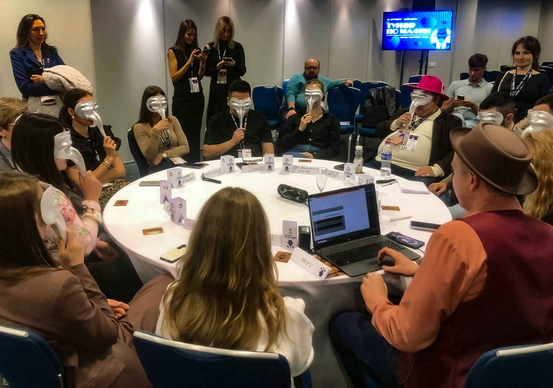 Мы сыграем две отборочные игры за пятью столами по 15 человек за каждым. По 2 лучших игрока от каждого стола по результатам индивидуальных рейтингов выйдут в финал и поборются за призы. Кто из участников — мафия, а кто — мирный житель? Вам придется применить весь свой интеллектуальный арсенал и мастерство оратора, чтобы «выжить» и, если повезет, не стать жертвой маньяка. Вы или Вас? Вести игры будут профессиональные ведущие.