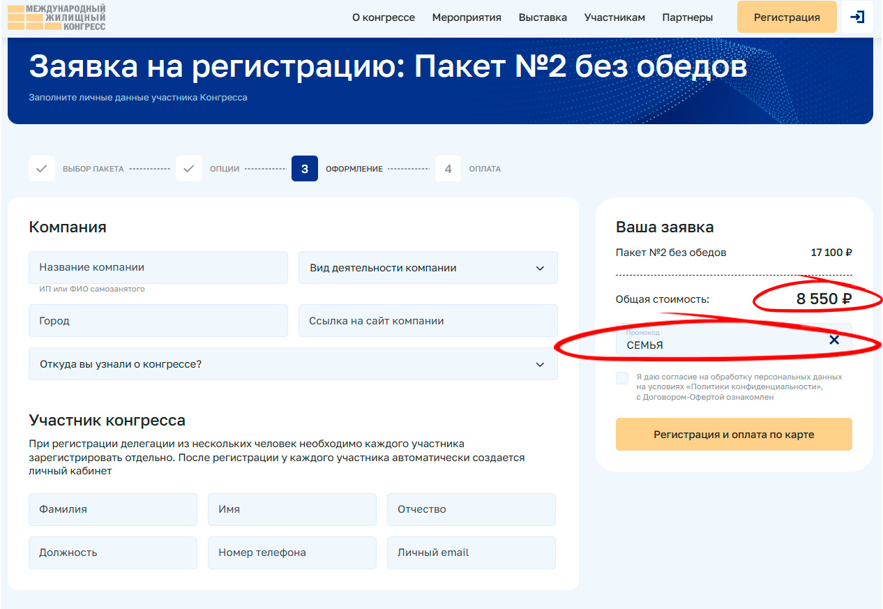 4. В анкете при оформлении заполняете собственными данными все необходимые строчки — блоки Компания и Участник конгресса.
