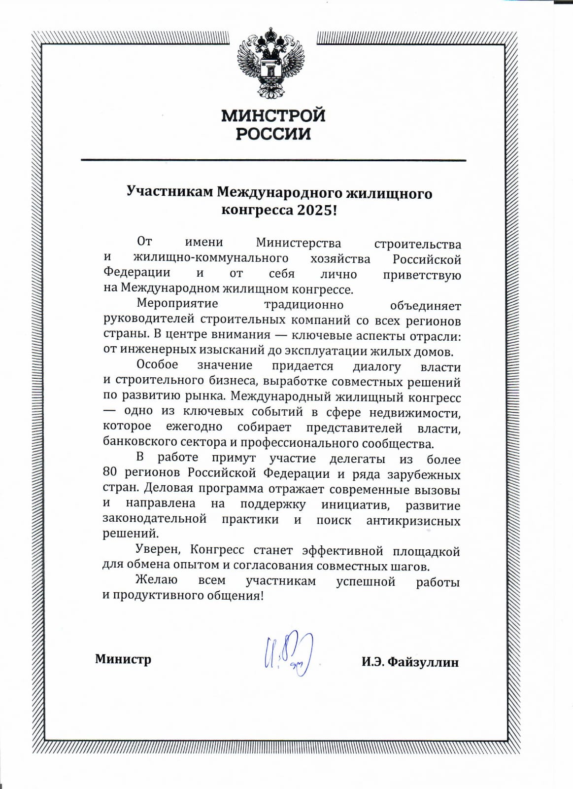 Министр строительства и ЖКХ приглашает на XXVII Международный жилищный конгресс.