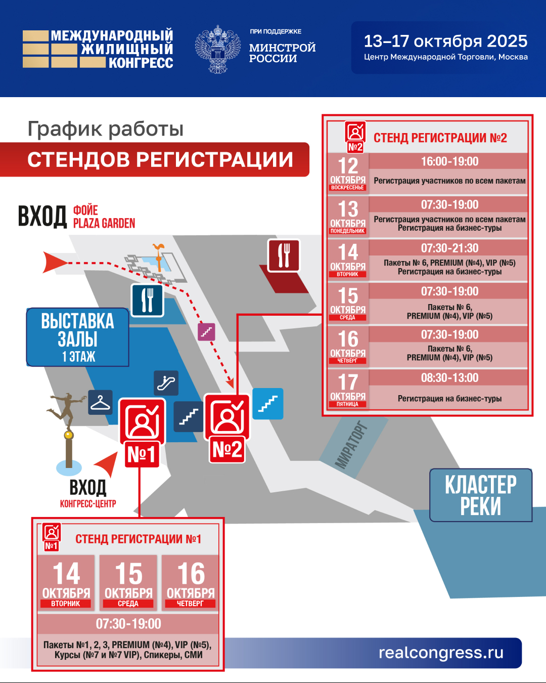 🕰 Регистрация на главное событие года в сфере недвижимости открывается 12 октября в 16:00 по мск. Получить бейдж можно на стенде регистрации № 2 – вход через фойе отеля Plaza Garden. На стенде также можно будет приобрести дополнительные опции: тренинги, билеты на культурные события.